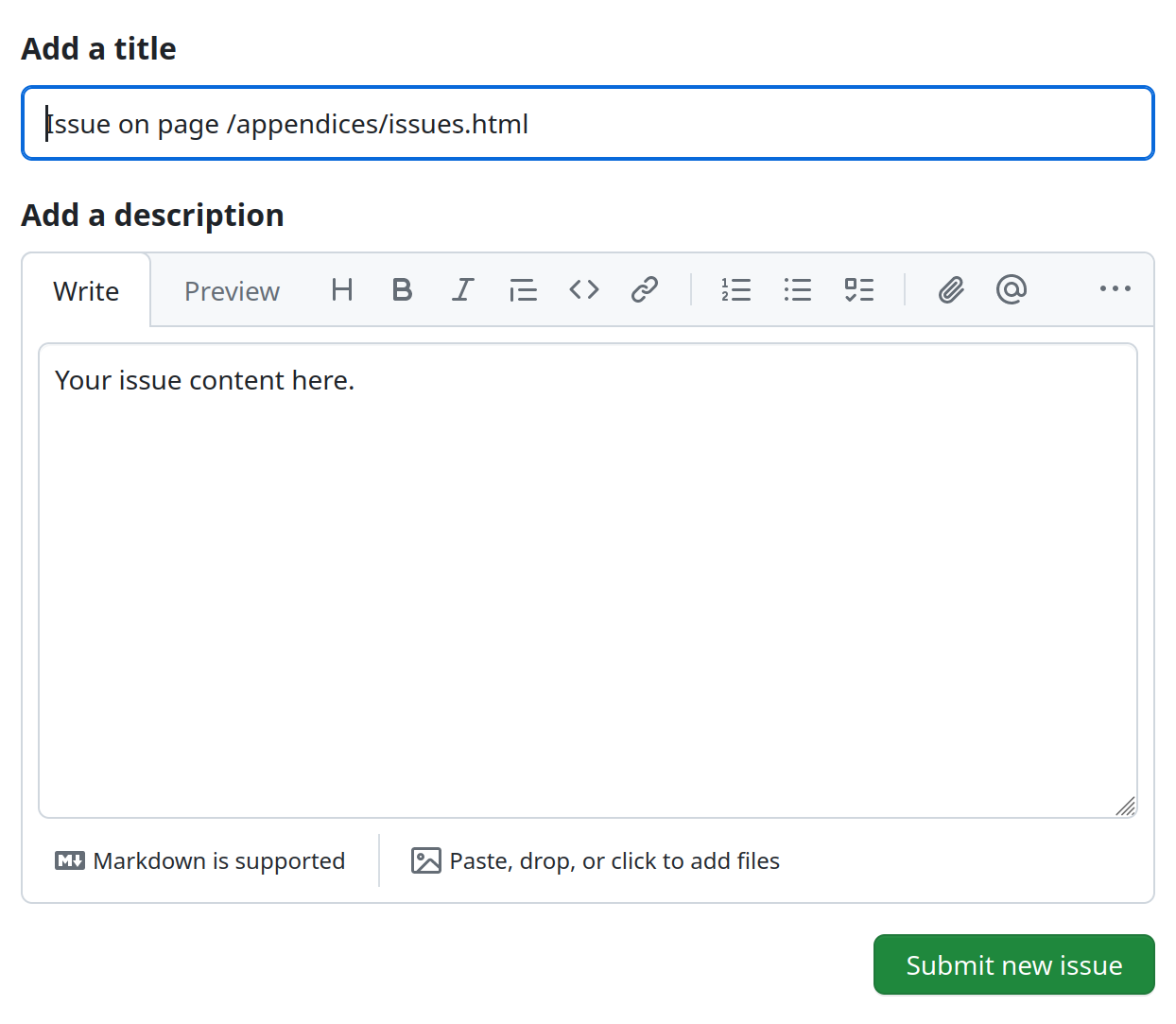 Once you are logged in, a new issue form will be opened. The title of the issue is prepopulated with the title of the page you were on when you clicked the “Open an issue” button. You can change the title to better describe the issue you are reporting. When completing the form please include details that will help us reproduce the issue, such as the browser you are using and the steps you took to encounter the issue. Screenshots are also helpful; you can paste them directly into the issue description. When you are finished, click the “Submit new issue” button at the bottom of the form.
